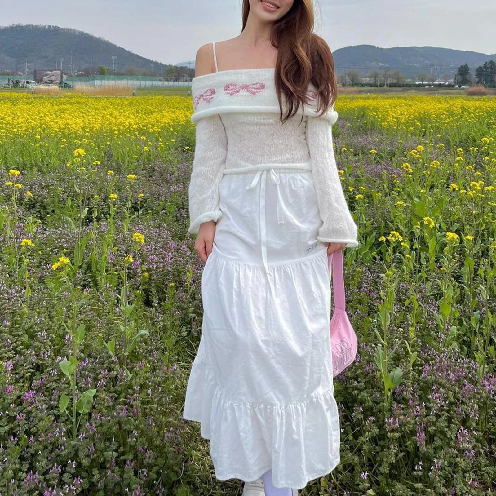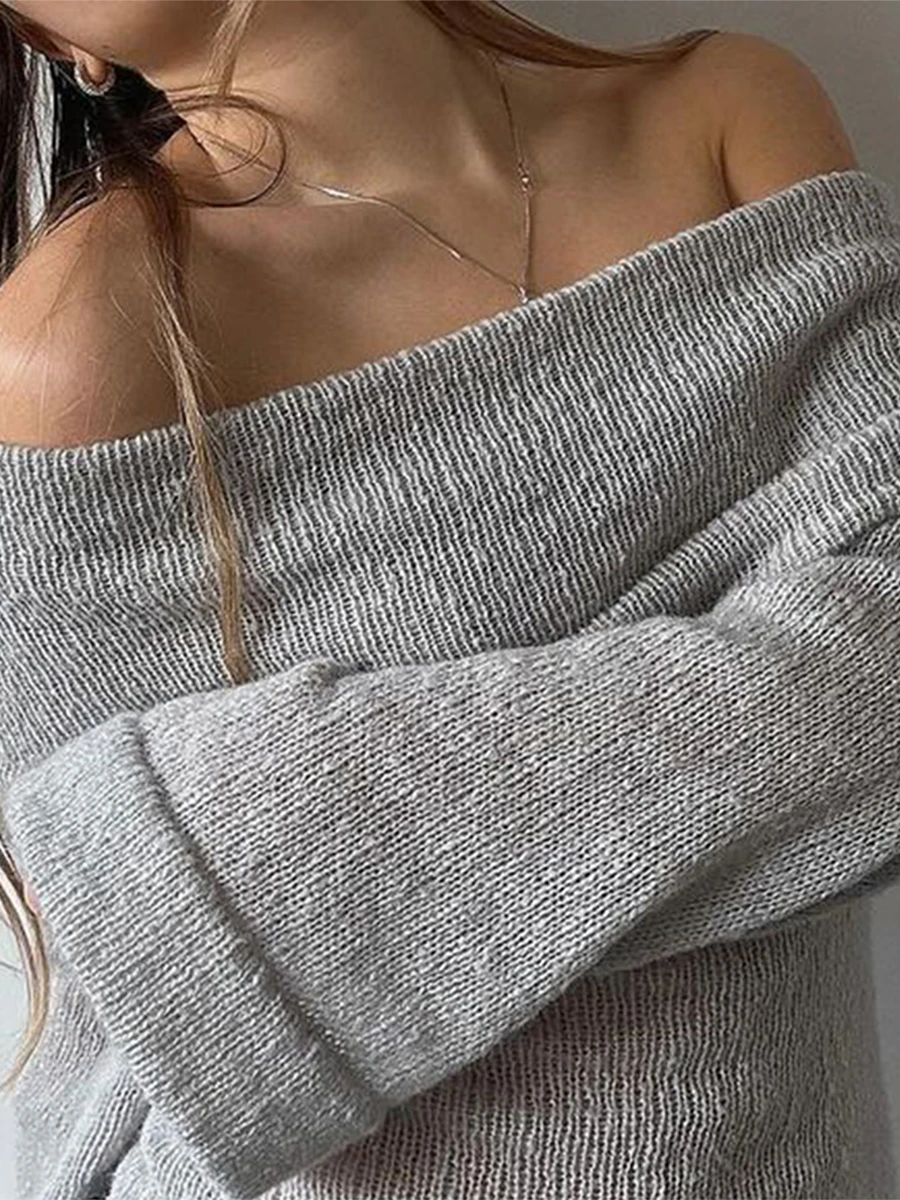MQTIME - Women's Y2K Cute Off Shoulder Sweaters Chest Folding Slash Neck Flare Long Sleeve Slim Fit Knitted See-through Tops