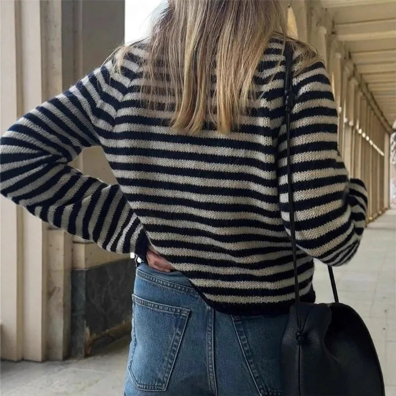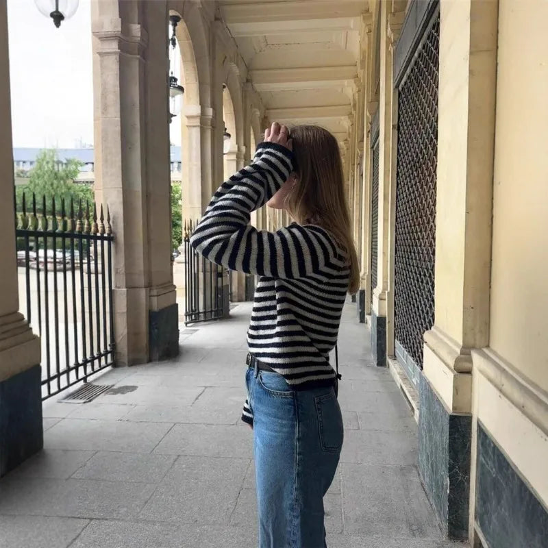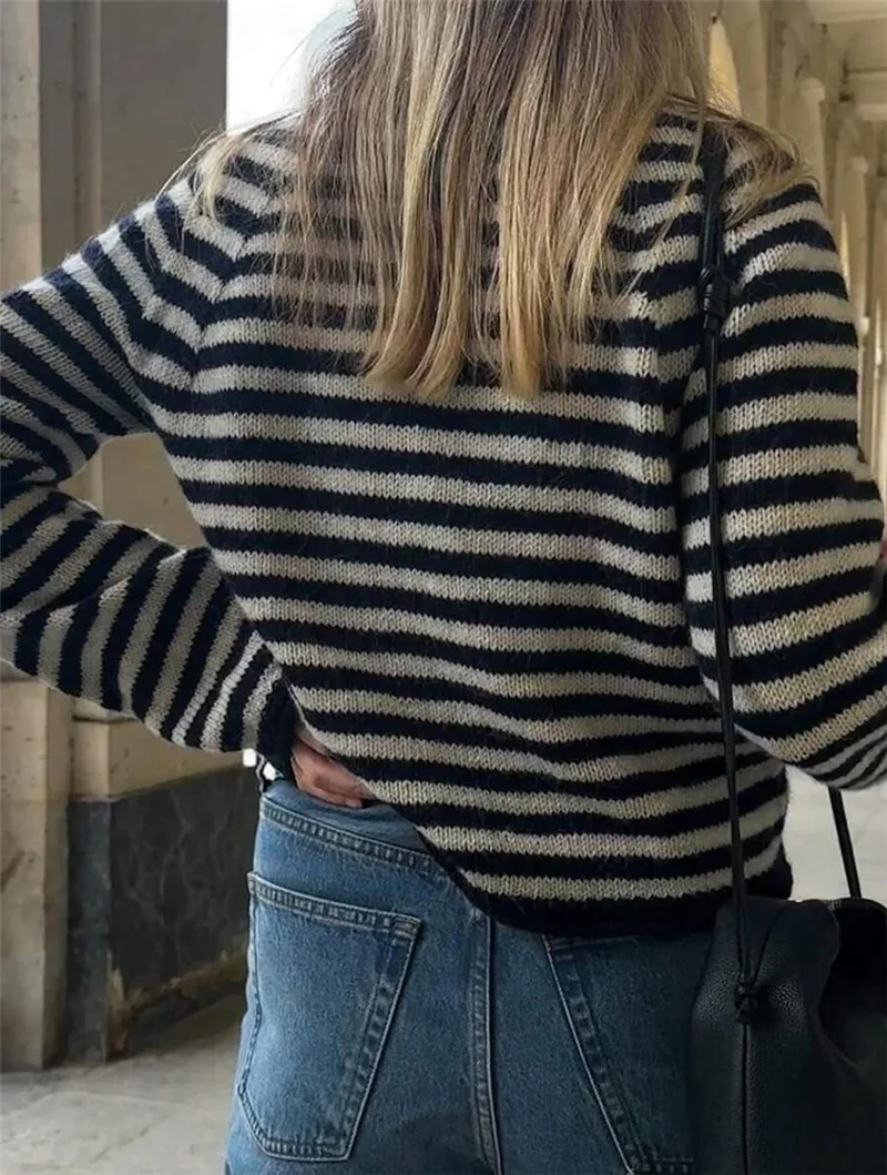 MQTIME - Autumn and Winter New Product Simple Contrasting Color Striped Round Neck Knitted Pullover Long Sleeved Elegant Sweater