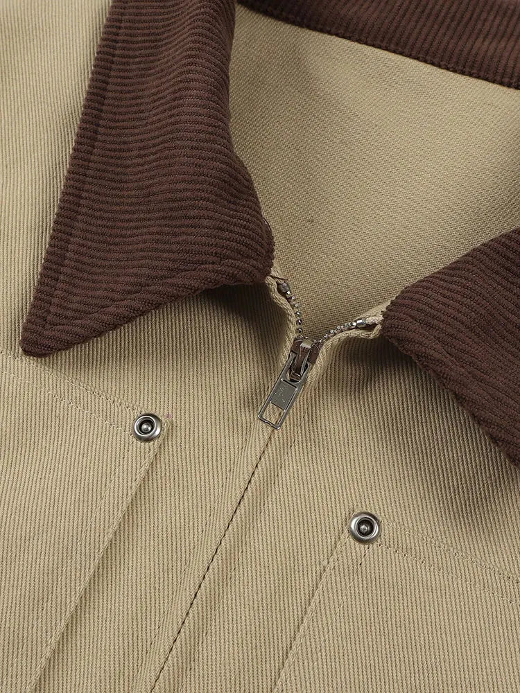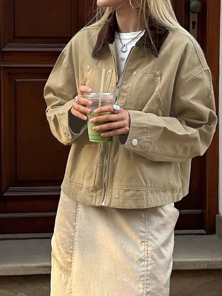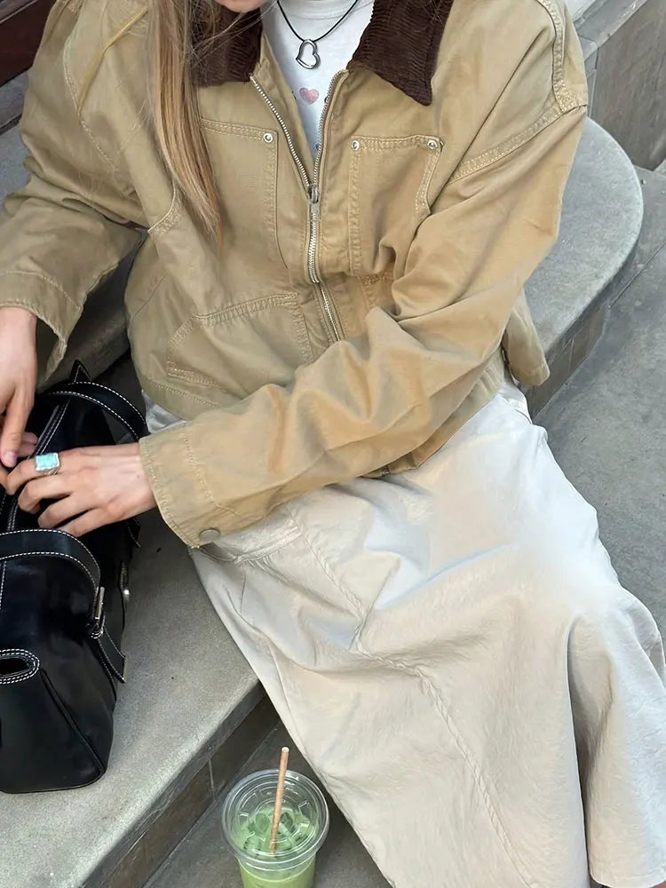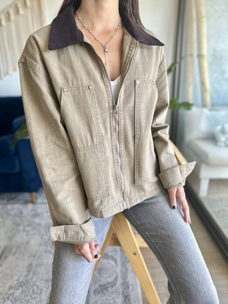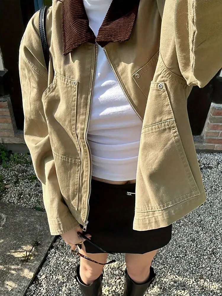 MQTIME - Fashion Basic Lapel Stitching Long-Sleeve Zip-Up Knit Shirt Jacket Khaki Pockets Winter Coats Top Korean Popular Women's Clothes