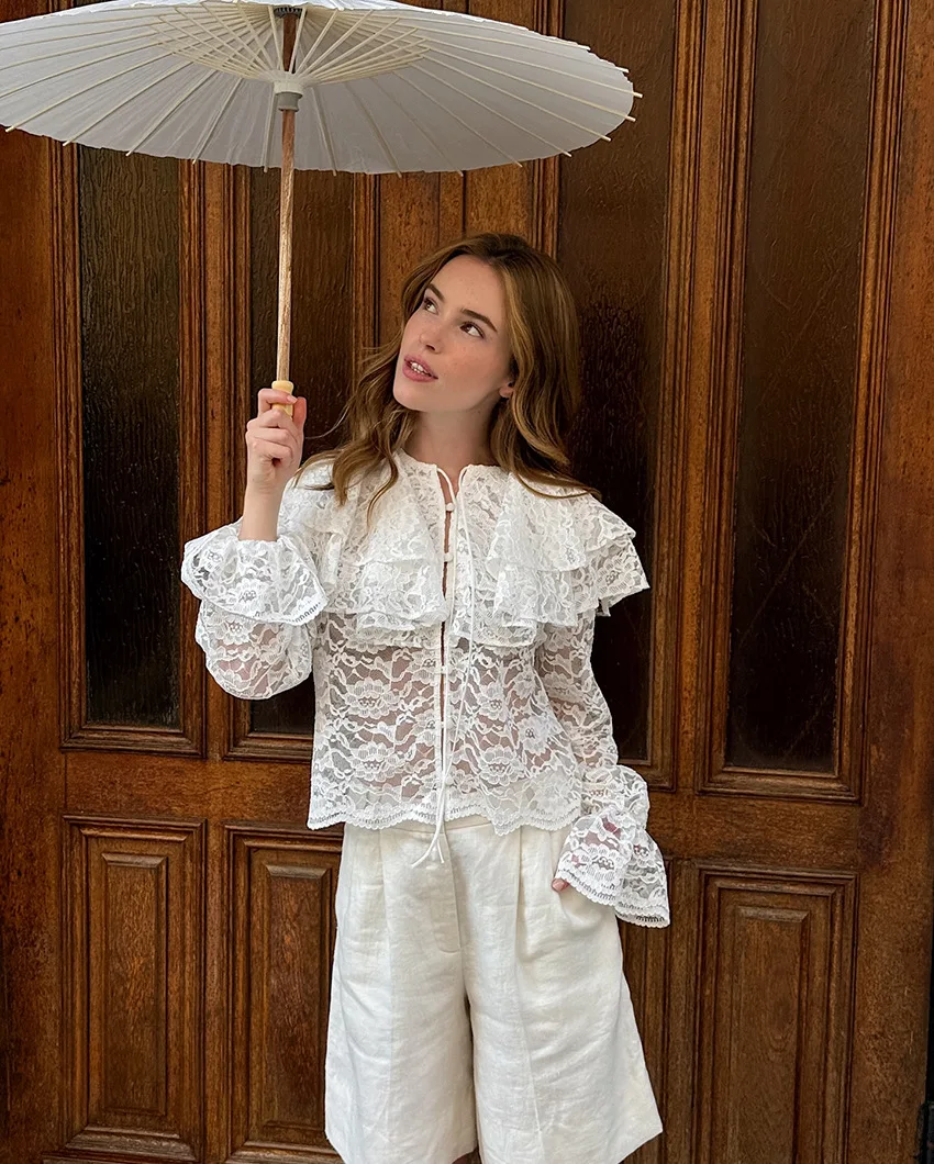 MQTIME - Autumn French Ruffle Lace Blouse Women Fashion Loose Bell Sleeve Shirt Beige