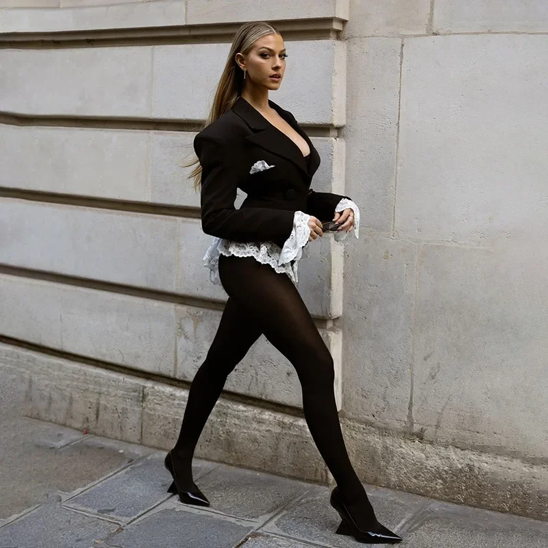 MQTIME - Lace Fashion Suit Jumpsuit Female Blazer Body Top V-Neck Slim Long Sleeve Sexy Cardigan Streetwear Women Black Rompers New