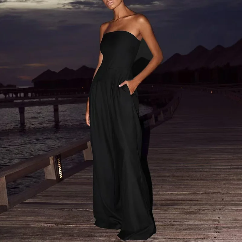 MQTIME - Simple Solid Loose Playsuit Casual Women Strapless High Waist Wide Leg Romper New Summer Off Shoulder Pocket Commuting Jumpsuit