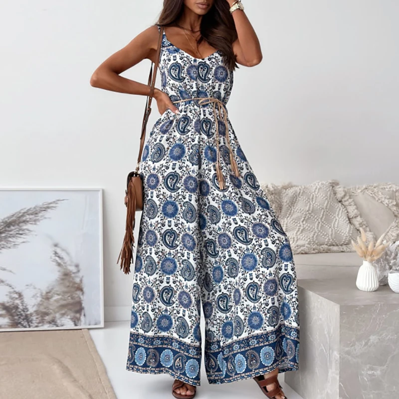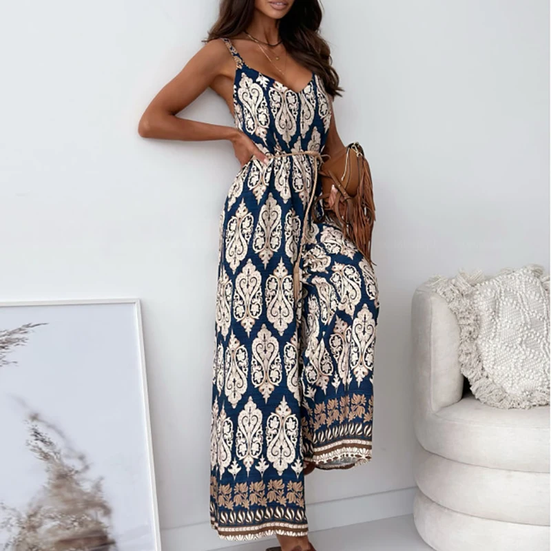 MQTIME - Wide Leg Loose Combination Female V-Neck Romper Women's One Piece Casual Pattern Print Sleeveless Summer Commuter Jumpsuit