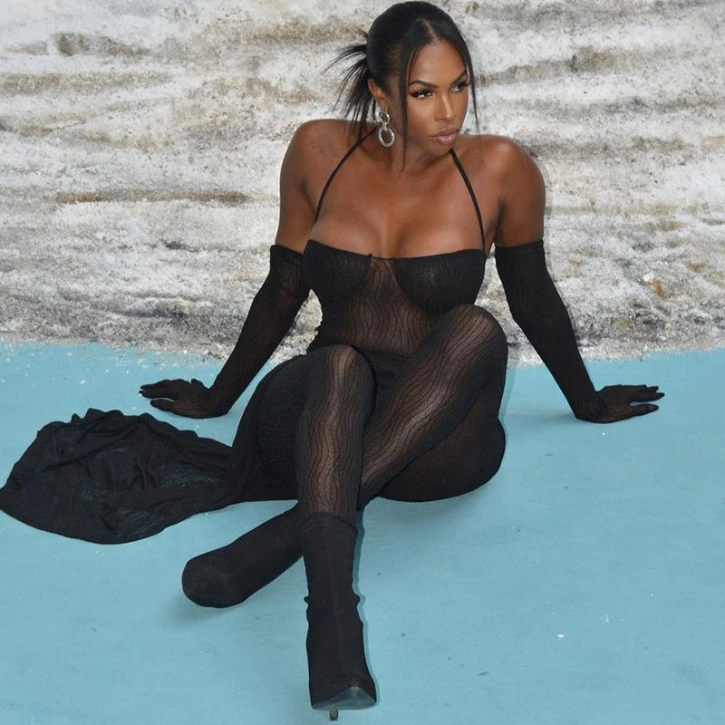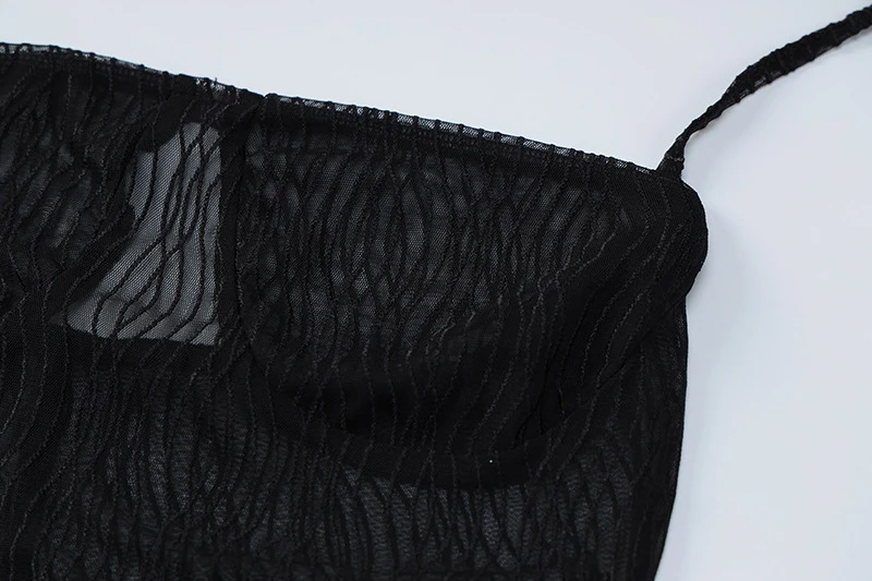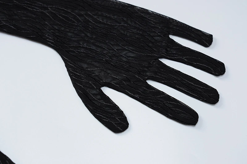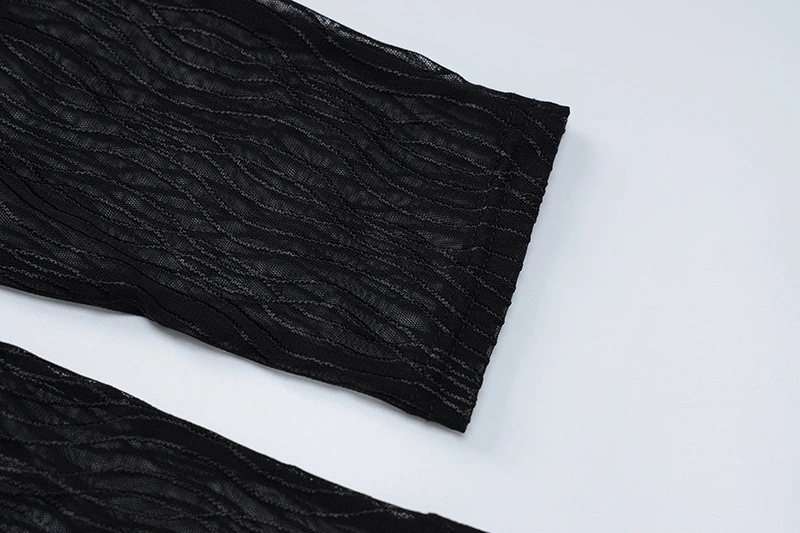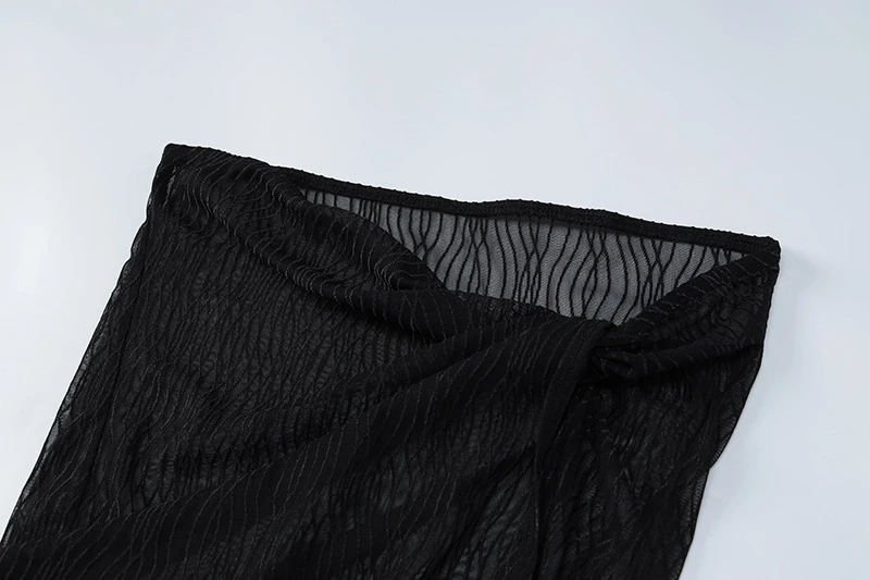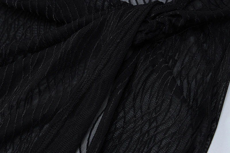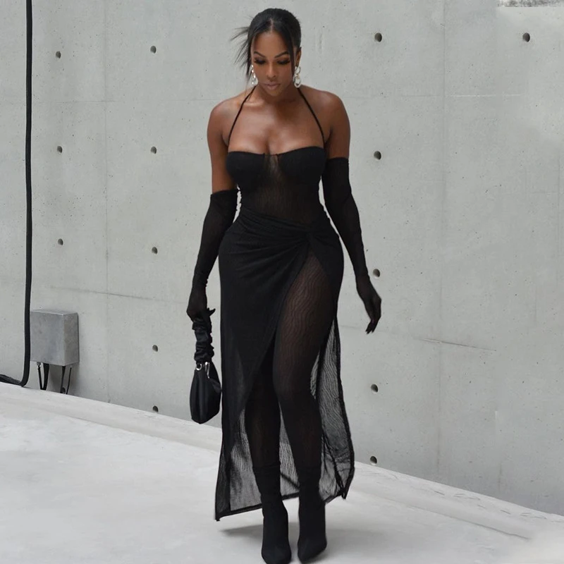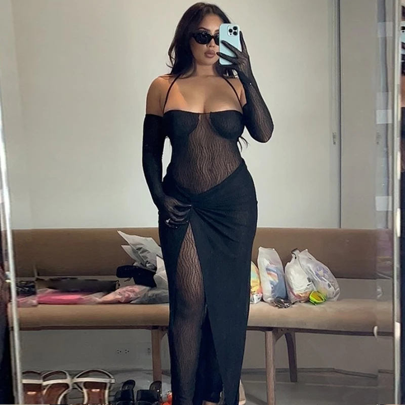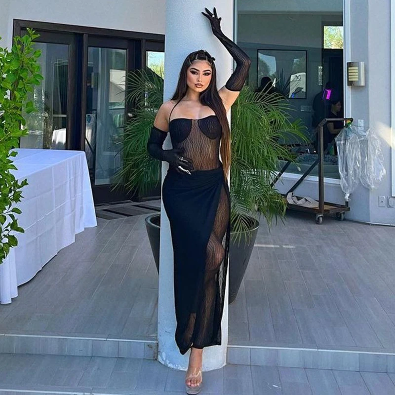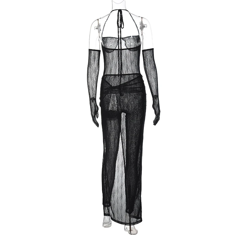 MQTIME - Women Sexy Sheer Mesh 3 Piece Sets Strapless Lace Up Halter SKinny Jumpsuit Tie Maxi Skirt Long Sleeve Gloves Club Party Suits