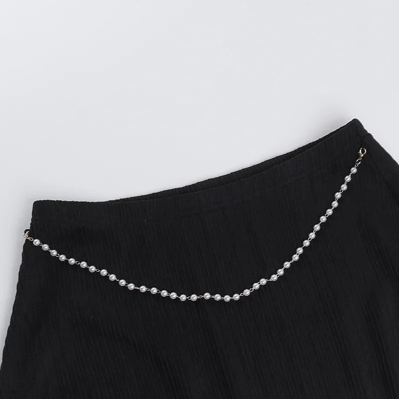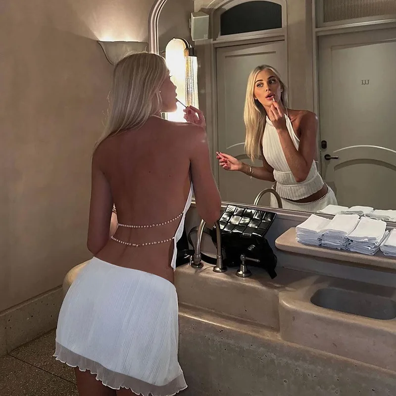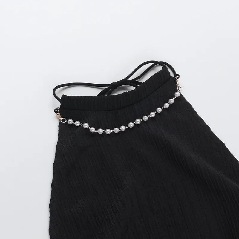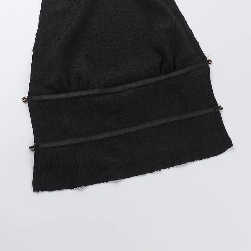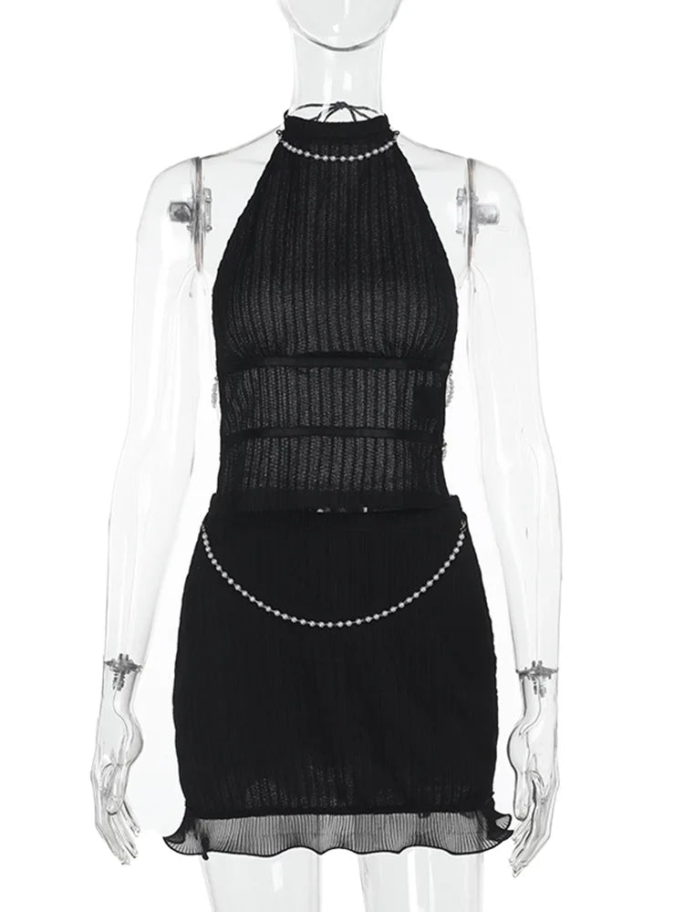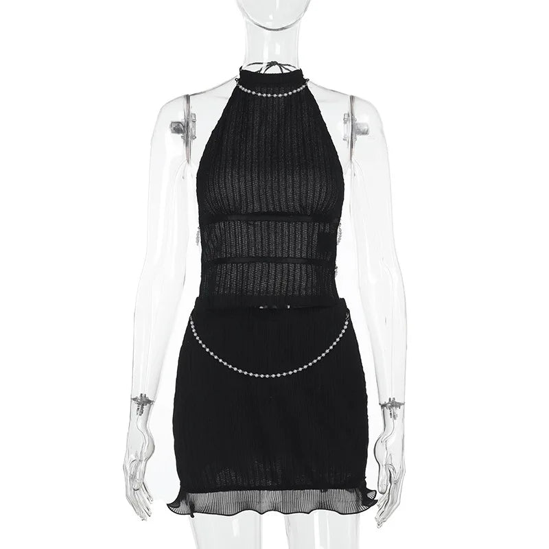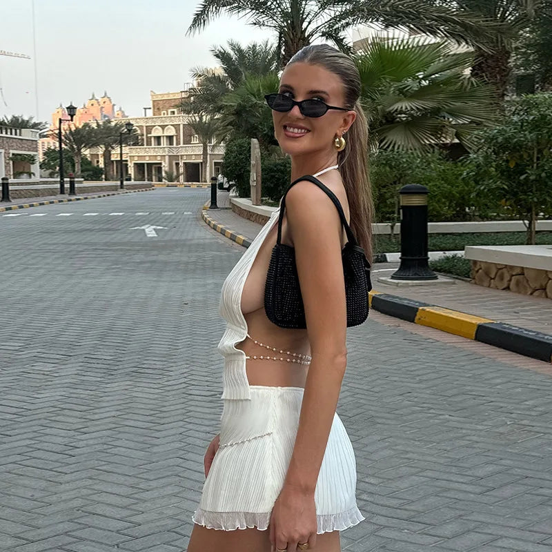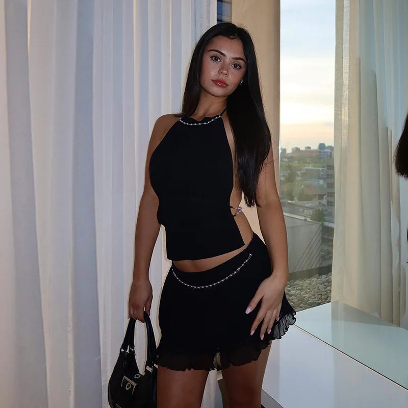 MQTIME - Backless Cropped Halter Vest Hip Package Short Skirts Beach Y2K Sexy 2 Pieces Outfits Vacation Beading Mini Skirt Sets For Women