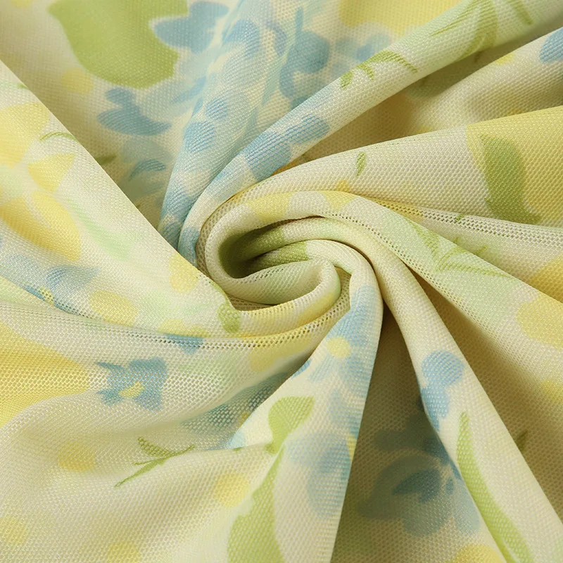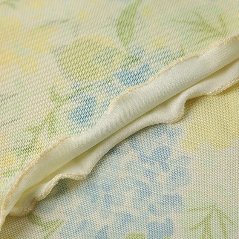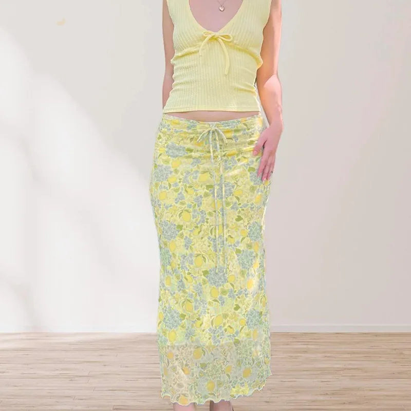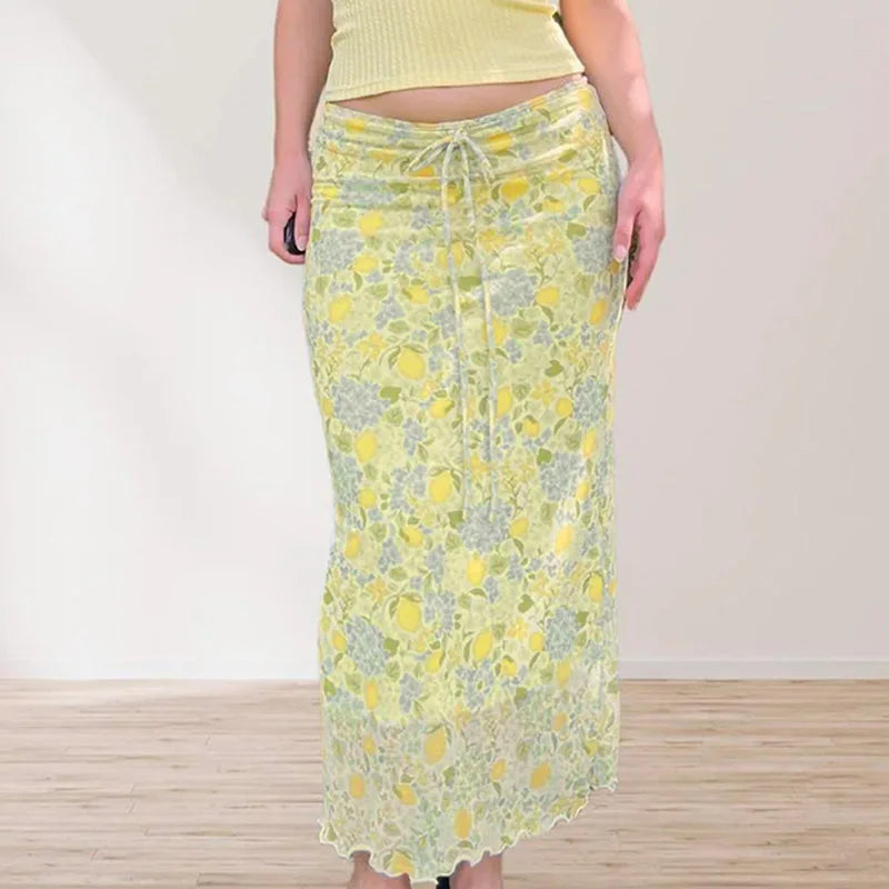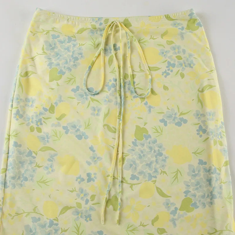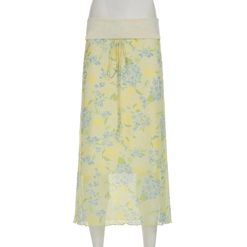 MQTIME - Women Holiday Outfits Fairycore Florals Print Lace-up A-line Skirts Y2K Aesthetic Slim Mesh Skirt Chic Beachwear Bottoms