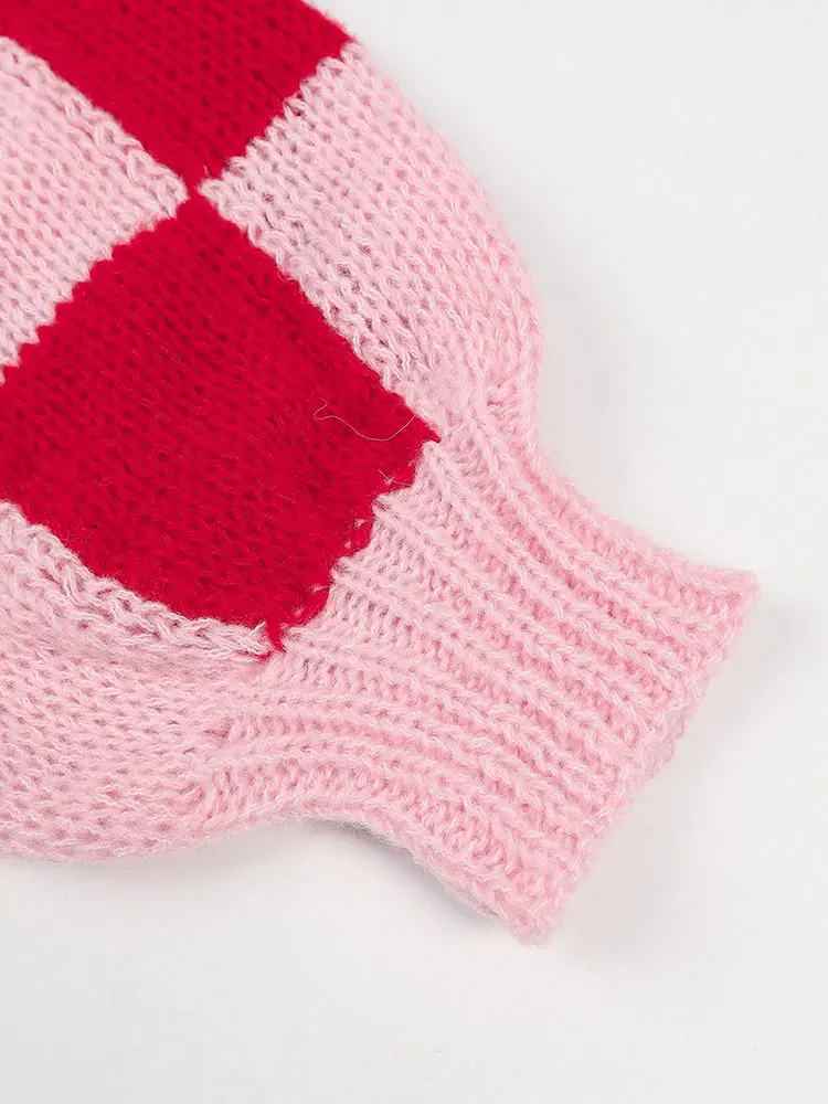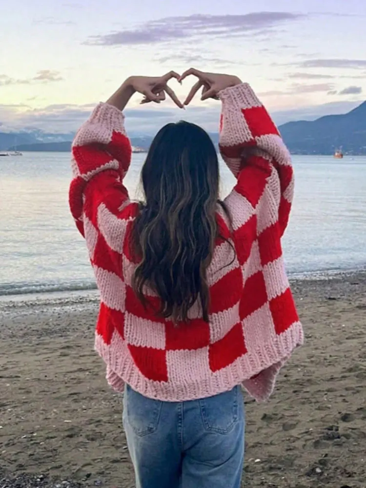 MQTIME - New Holiday Versatile Red Pink Plaid Sweater Cardigan Fashion Elegant Buttonless Long Sleeve Coats Loose Simple Wool Knit Women