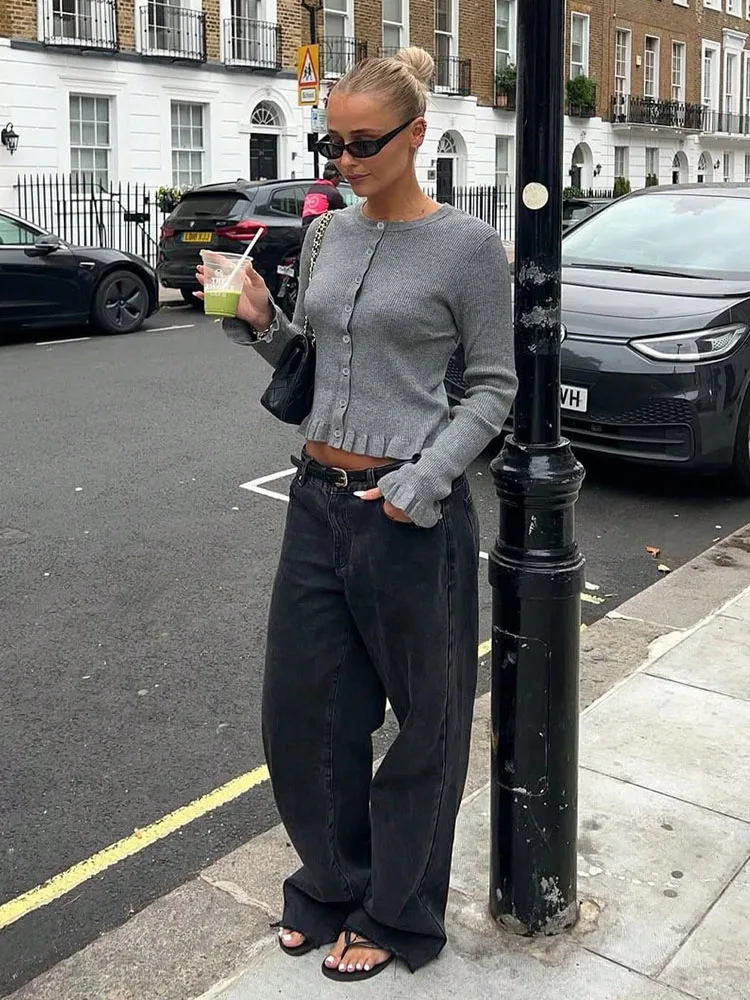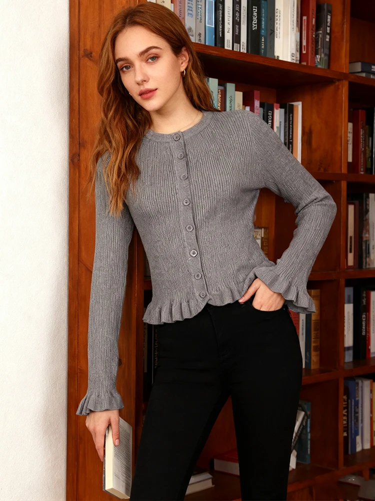 MQTIME - New Korean Round Neck Button Knitted Cardigan Long Sleeve Lace Top Coat Simple Elegant Autumn Women's Clothing Grey Soft Sweater