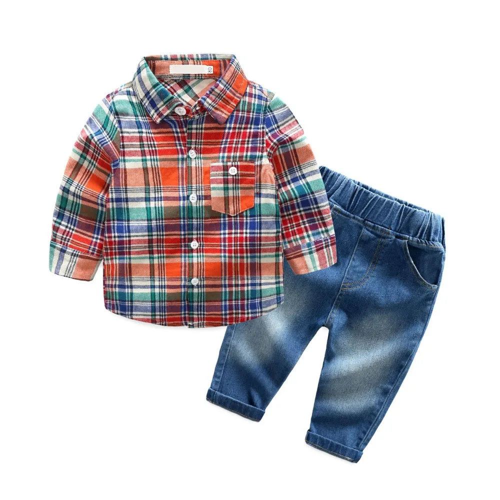 MQTIME - 2Piece Sets Spring Autumn Toddler Boys Boutique Clothing Korean Fashion Plaid Long Sleeve Baby Tops+Jeans Newborn Clothes