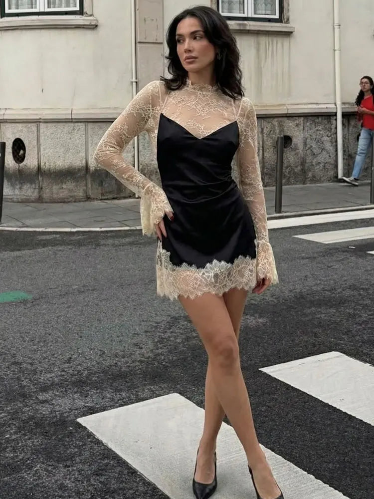 MQTIME - French Elegant Sexy Women Lace Patchwork Mini Dress Contrast Slim Long Sleeve Dresses Fashion High Street Lady Chic Dress