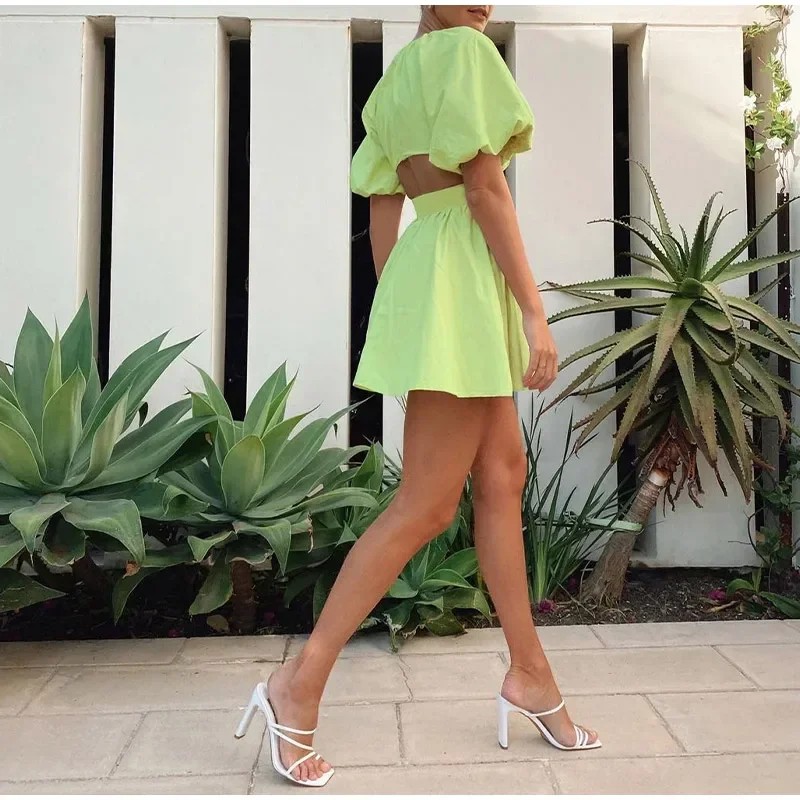 MQTIME - Green Puff Sleeve Elegant Woman Summer Shirt Dresses Female Zipper Fashion Spring Vintage Sexy Backless Casual Vestido New