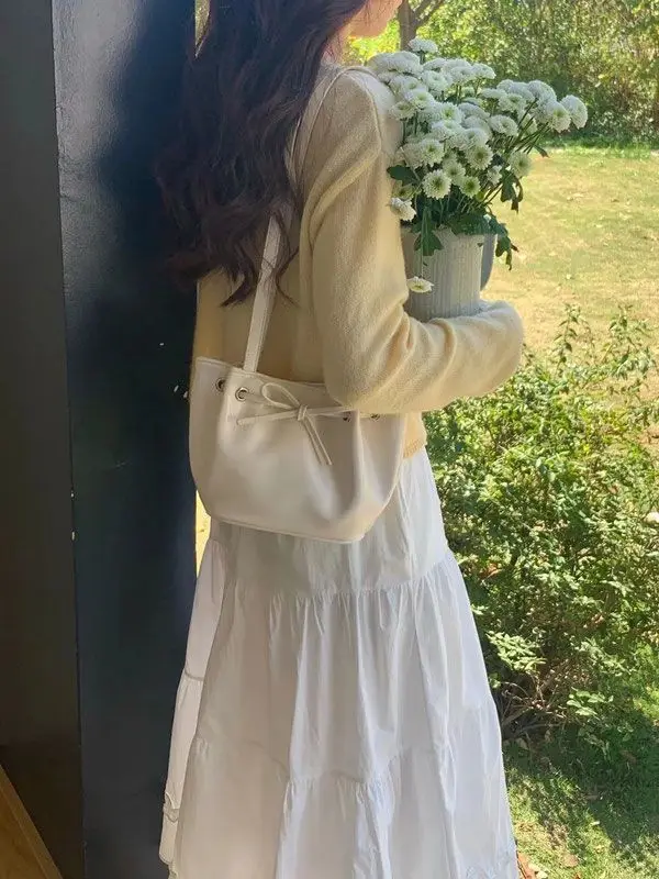 MQTIME - Harajuku Bow Blue Underarm Bags Women Hot Girls Leather Chic Casual Y2k Handbag Female Retro Cute Mini Bucket Bag 2024