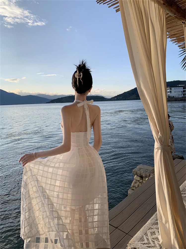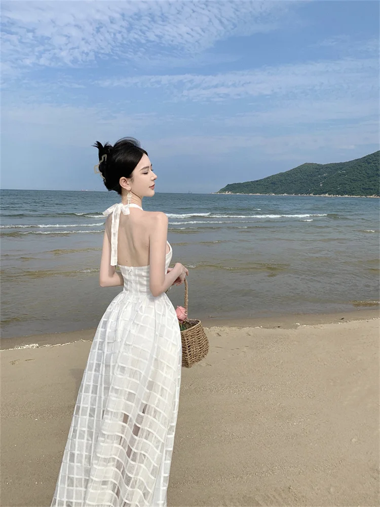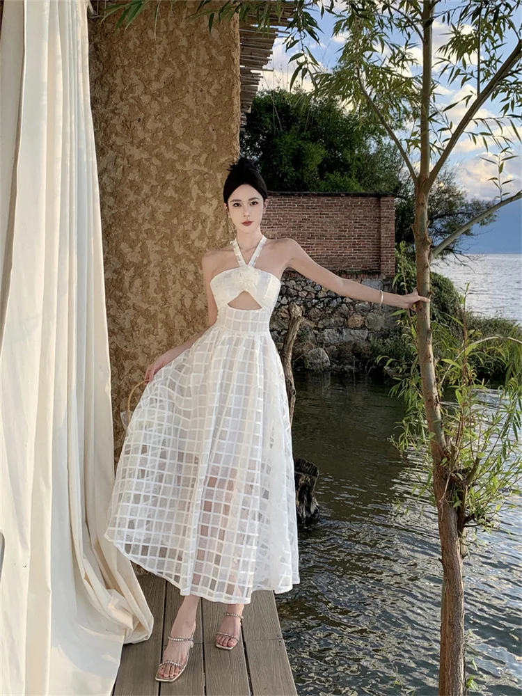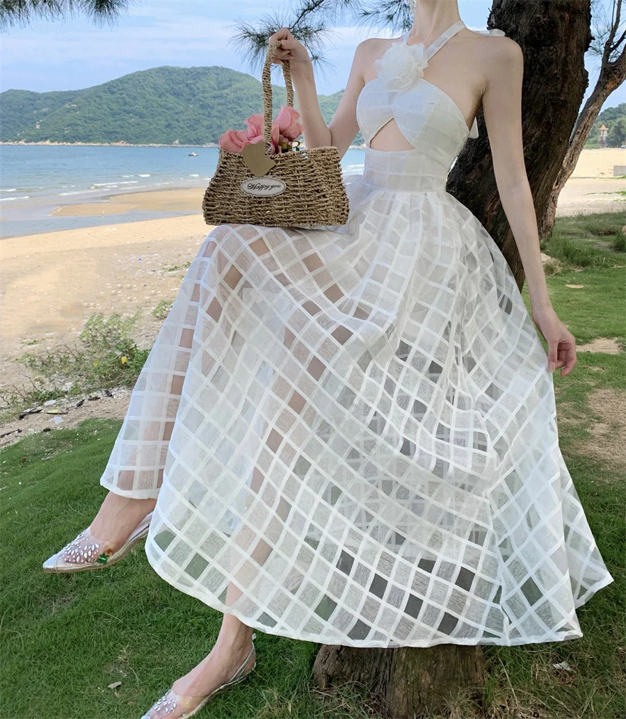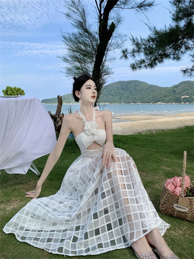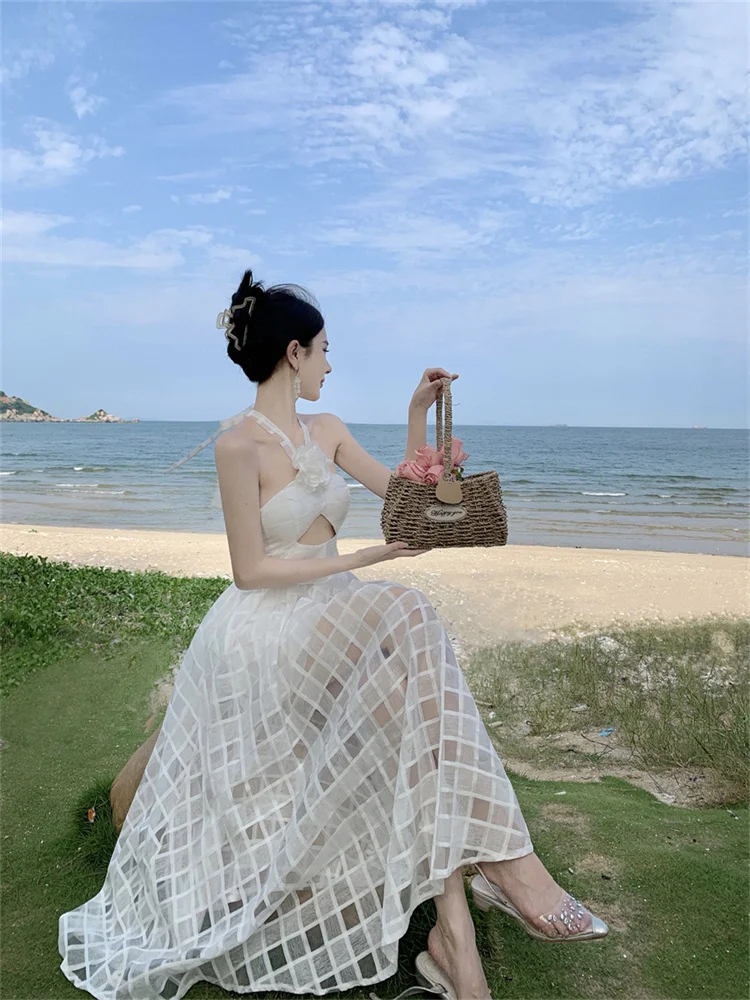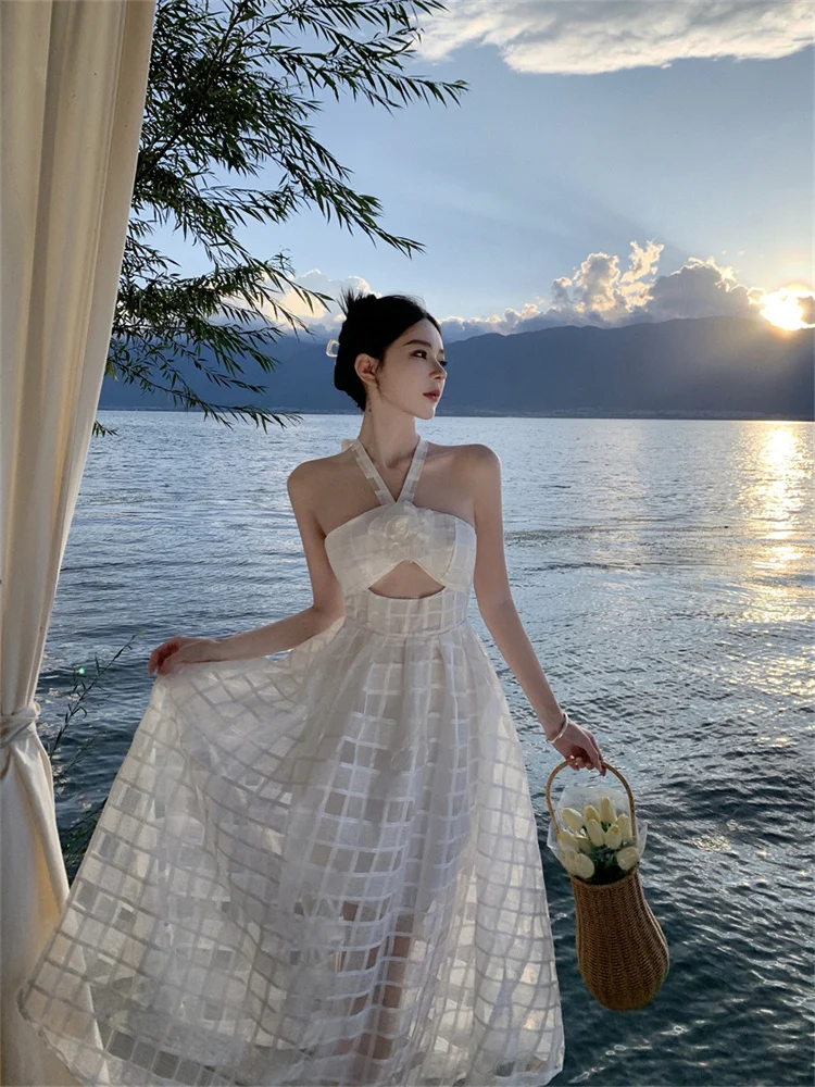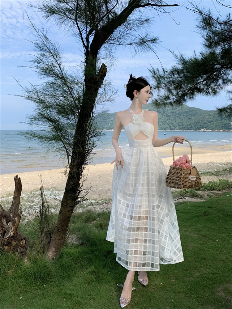 MQTIME - New Fairy White Holiday Dress Temperament Flower Hanging Strap Neck Dress Sexy Beach Vacation Long Dress Vestidos Femininos