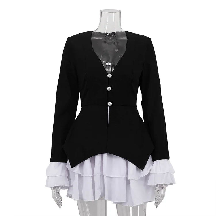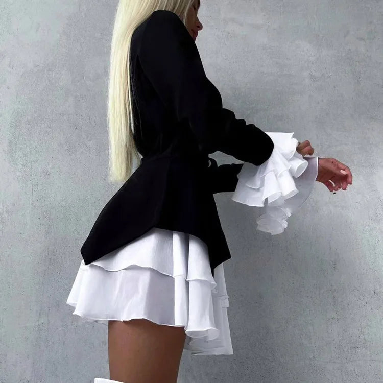 MQTIME  -  New Women's New Long Sleeved Mini Dress Sexy V-neck Fashionable Ruffle Edge Splicing Fake Two-piece Petal Sleeve Dress