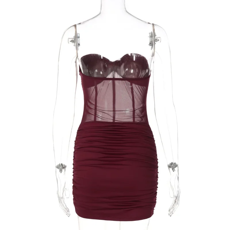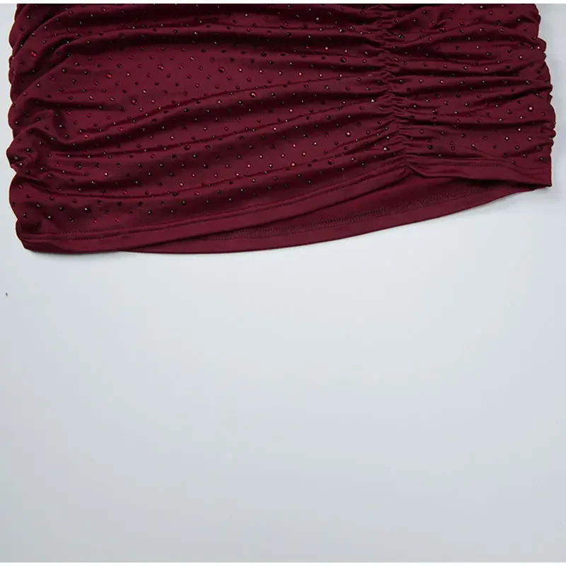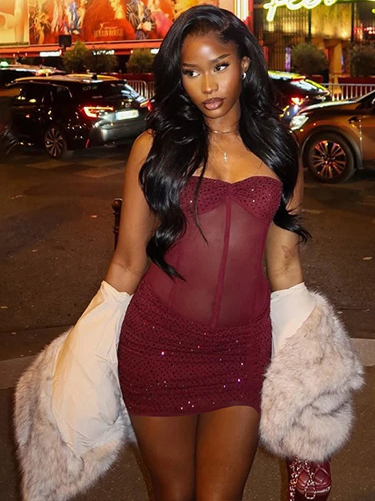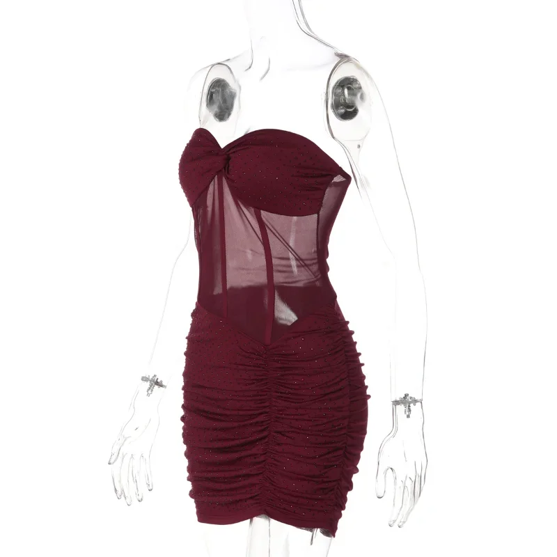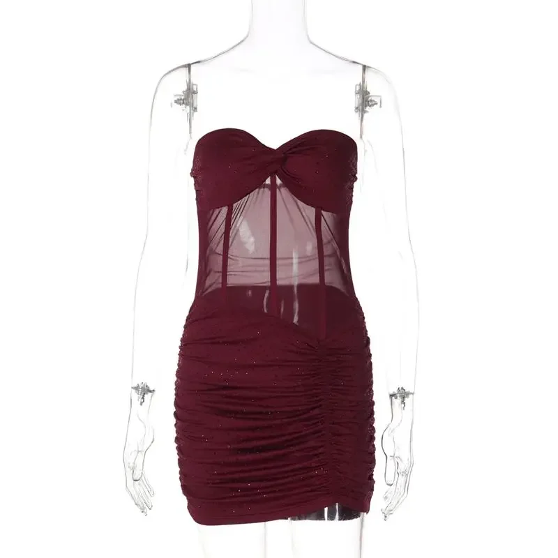MQTIME - Sexy Rhinestone Mesh Patchwork Slim Mini Dress Women Sleeveless Backless Pleated Bodycon Dresses 2026 Summer Evening Party Robe
