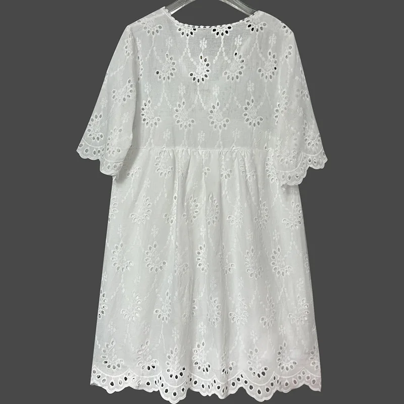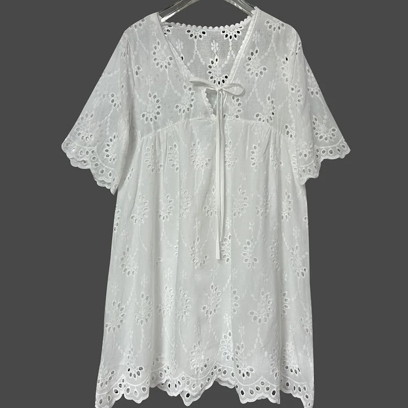 MQTIME - Sexy V Neck Lace-up Embroidery Lace Dress Autumn Half Sleeve Loose A-Line Party Dress Women Spring Jacquard Crochet Mini Dresses