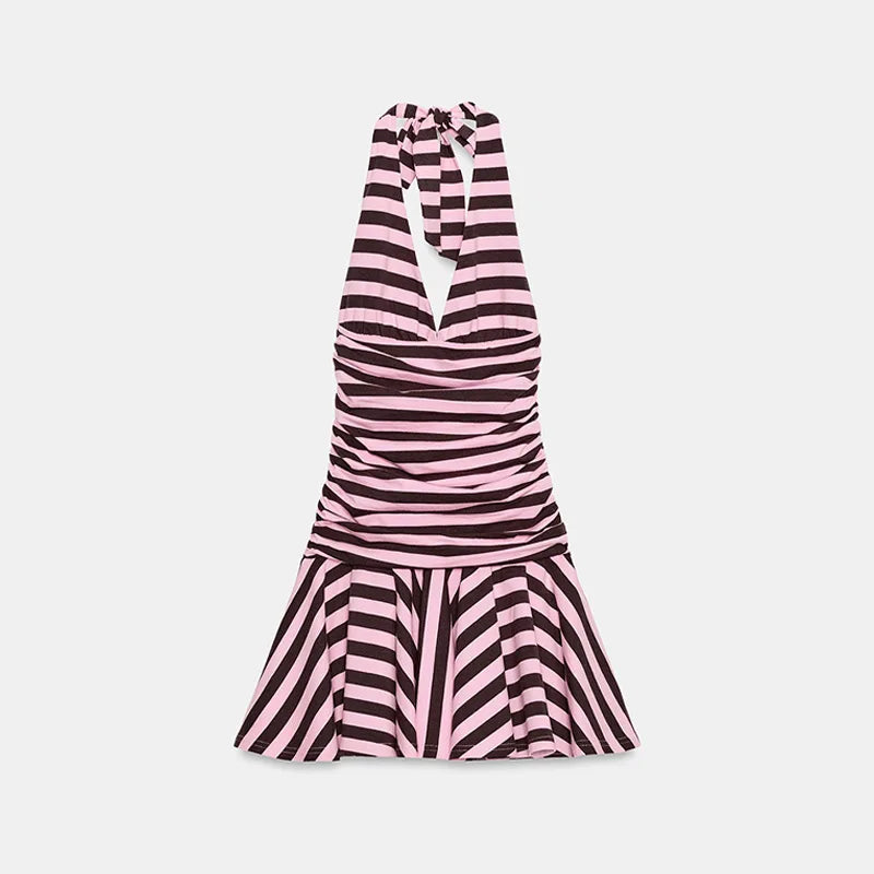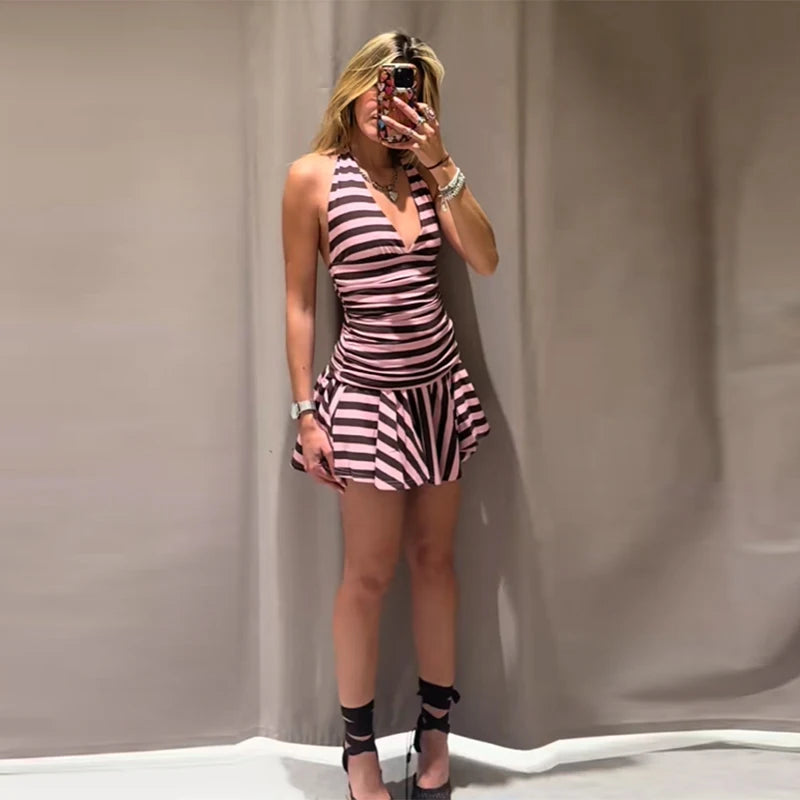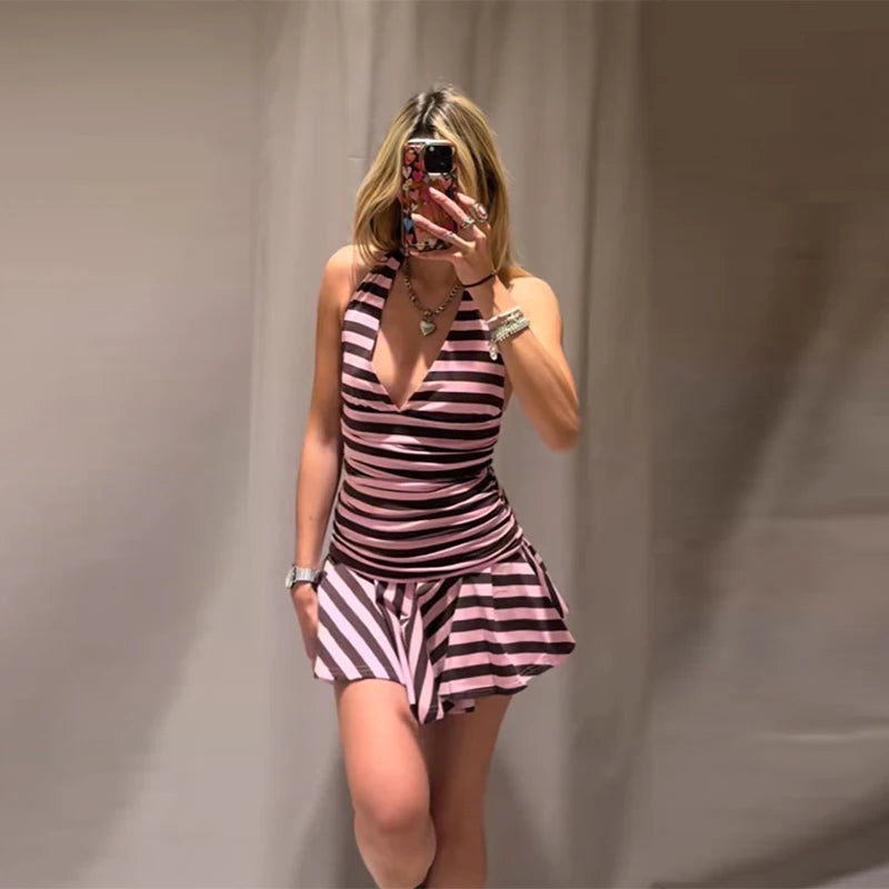 MQTIME - Sultry Y2k Striped Halter Neck Mini Dress Deep V-neck Sexy Bodycon Dress Women Summer Vacation Date Night Club Sweet Cute Wear