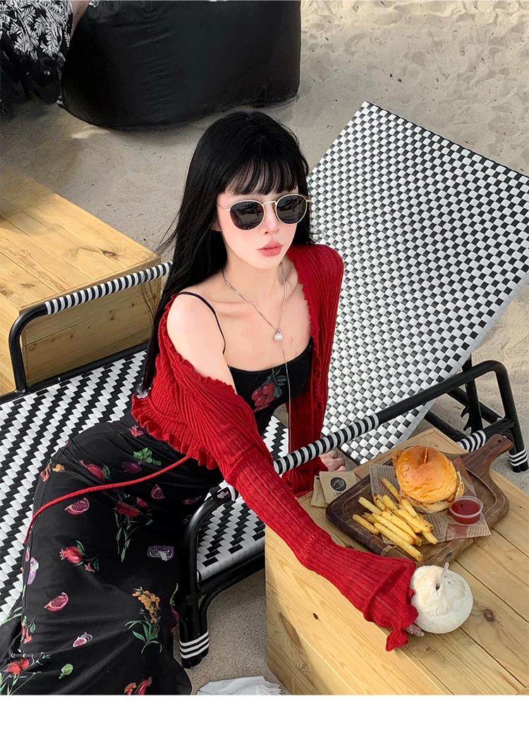 MQTIME - Summer Fruit Pattern Black Womens Straps Dress Sleeveless Sexy Holiday Splicing Mesh Wrap Buttocks Short Dress Suspender Skirt