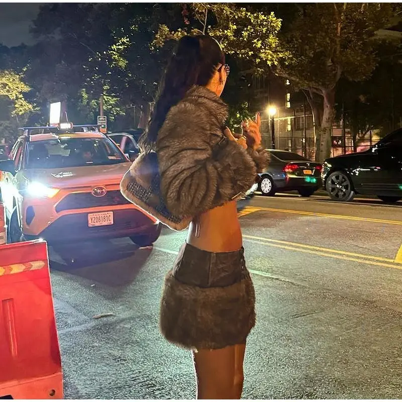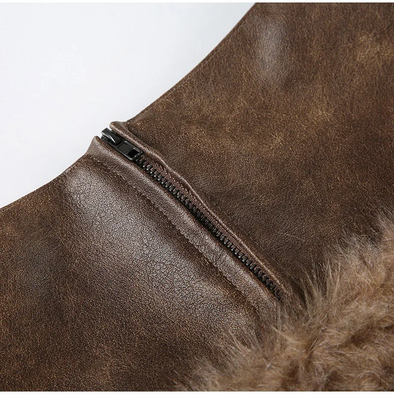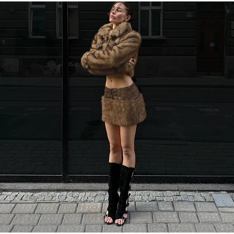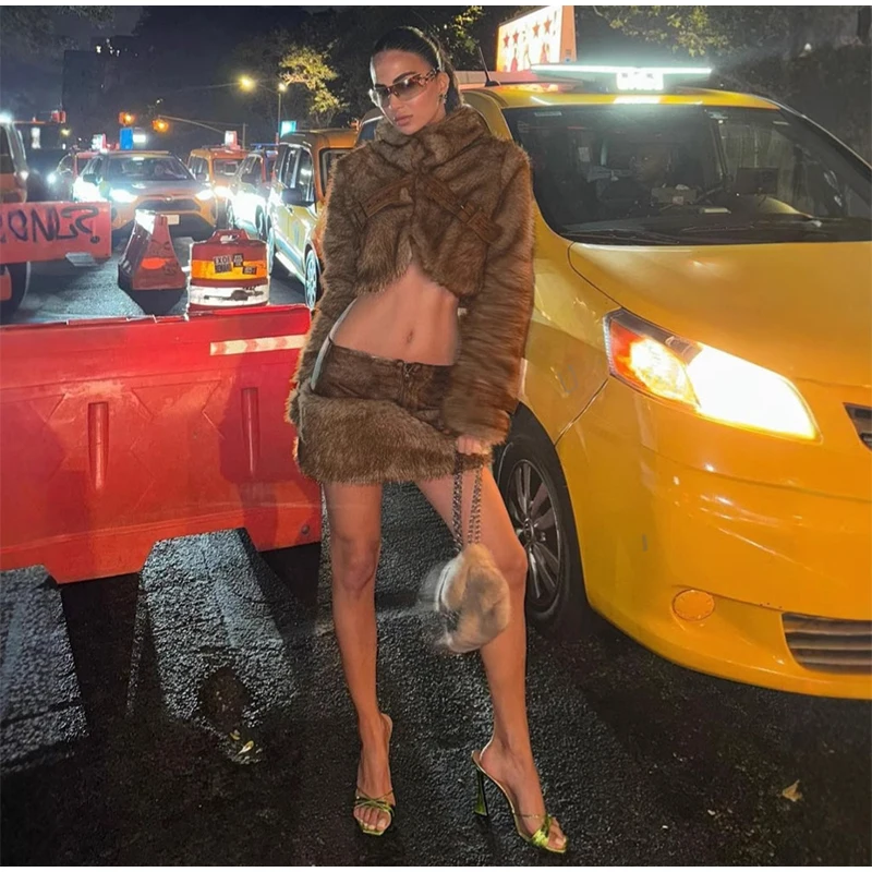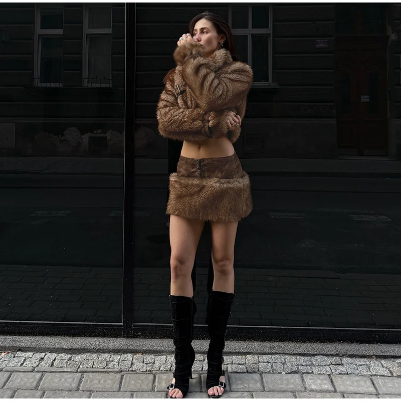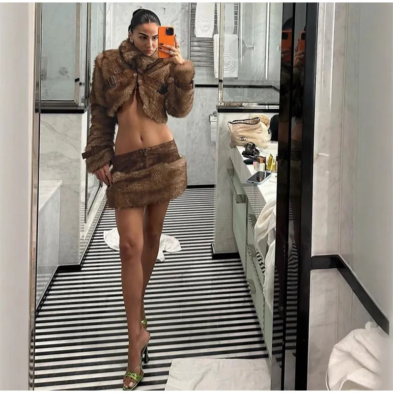 MQTIME - Vintage Faux Fur Coat Mini Skirts Woman's Sets Retro Plush Lapel Single Button Short Coats A-lined Skirt Set Female Chic Outfits