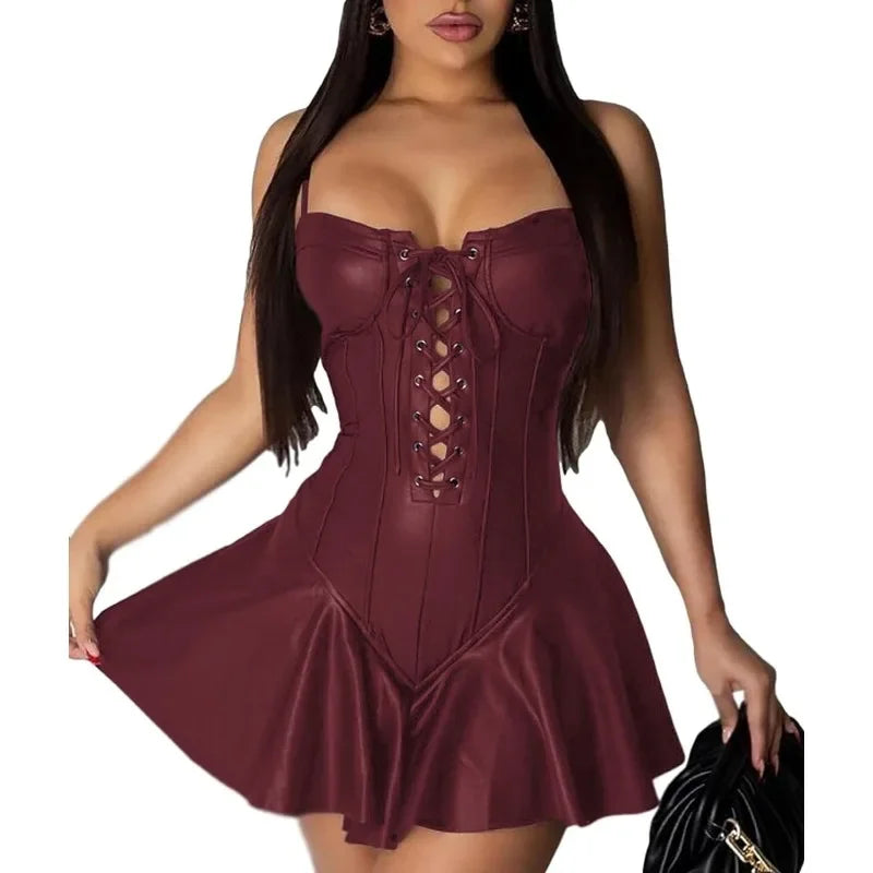 MQTIME - Women's Faux Leather Lace-Up Corset Dress, Sleeveless Pleated Bodycon, Mini PU Dress, Sexy Steampunk Club Wear