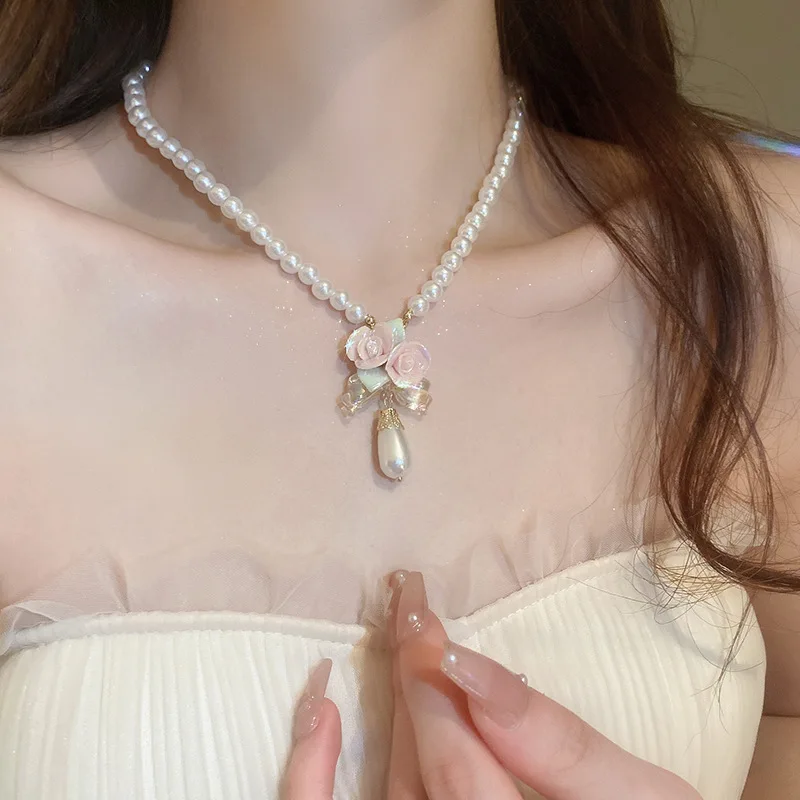 MQTIME - Women's Trendy Imitated Pearl Beaded Necklace Exquisite Waterdrop Pendant Earring Romantic Flower Earrings Bowknot Jewelry Sets